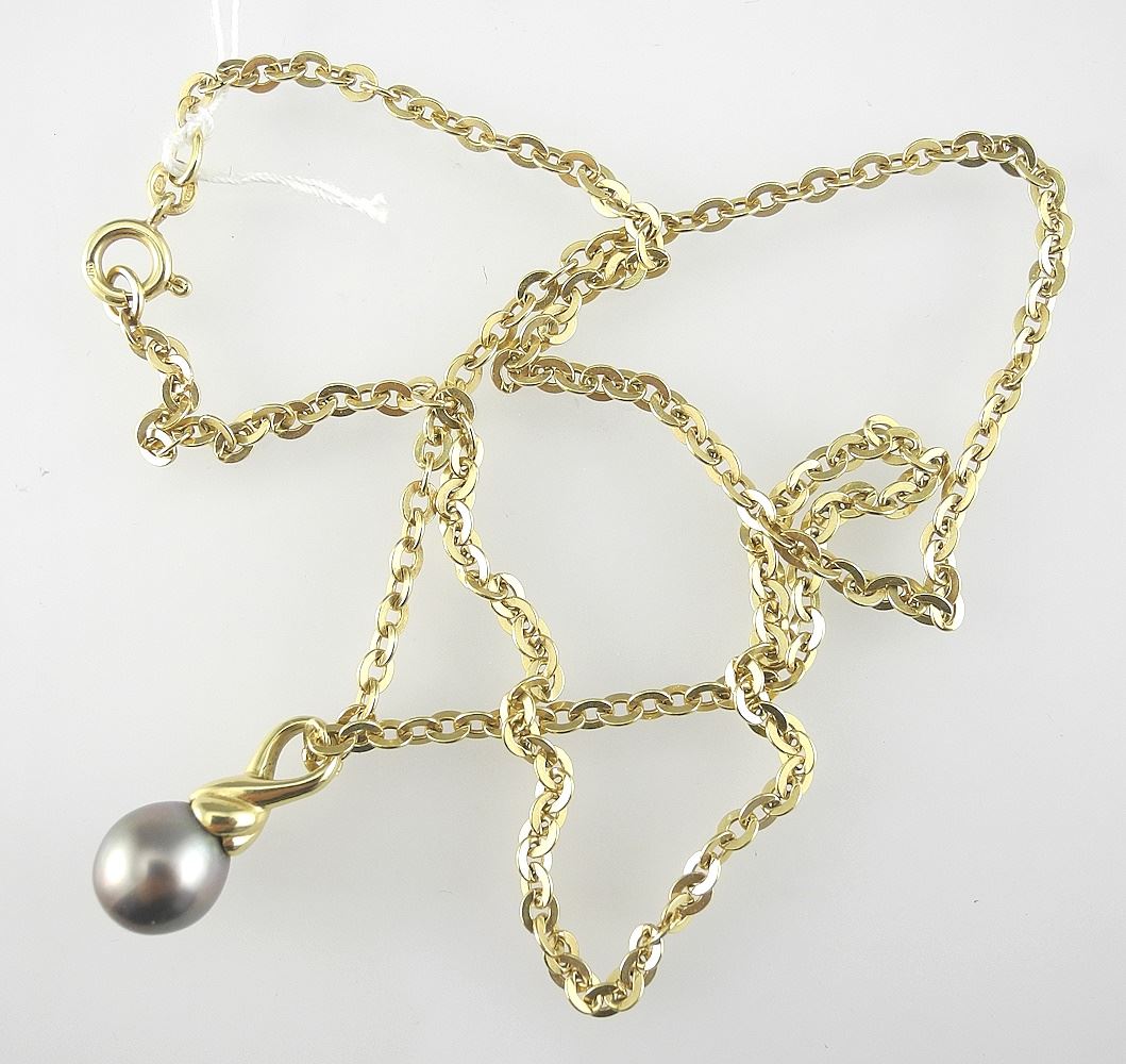 LOT 55 18K (marked) Gold Chain with Black Pearl Pendant (12.47g) & 14K Hematite Earrings. Estimate: $300 - $500 Sold For: $700 Auction Date: Tuesday, February 11 2025 at 4:00 PM