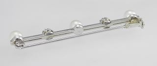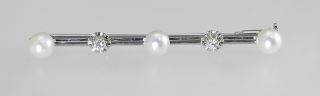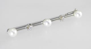 LOT 40 18K (marked 750) White Gold Diamond & Pearl Bar Brooch, 2 3/8"L, 5.5g. Estimate: $300 - $400 Sold For: $375 Auction Date: Tuesday, February 11 2025 at 4:00 PM
