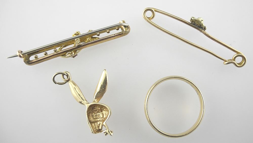 LOT 135 Three 10K Gold (marked) Jewelry Items (7.45g) & 9ct Brooch, 20g. Estimate: $60 - $100 Sold For: $600 Auction Date: Tuesday, February 11 2025 at 4:00 PM