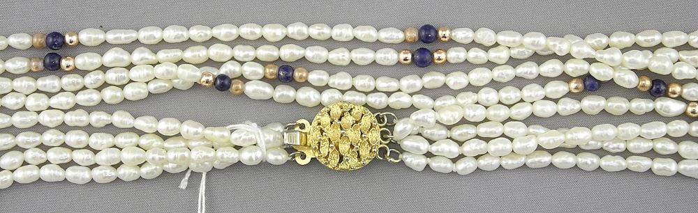 LOT 183 Quadruple Strand of Cultured Fresh Water Pearls (30"L) with Lapis & Gold Tone Spacers. Estimate: $100 - $200 Sold For: $200 Auction Date: Tuesday, February 11 2025 at 4:00 PM