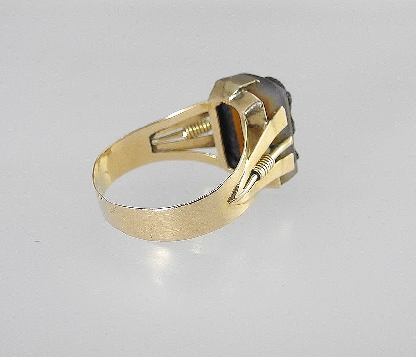 LOT 149 Unmarked Gold (tested 14K) with Glass Portrait Cameo, Size 8 1/8, 3.9g. Estimate: $160 - $250 Sold For: $150 Auction Date: Tuesday, February 11 2025 at 4:00 PM