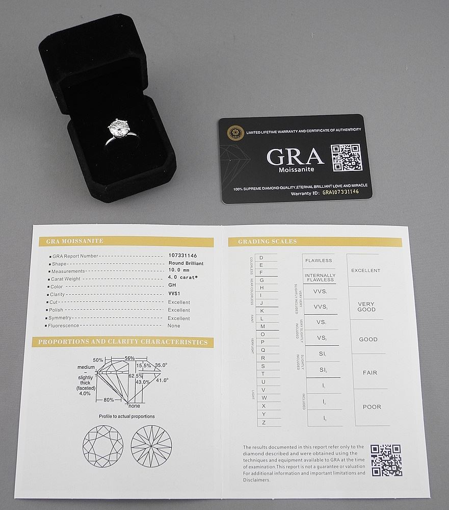 14K White Gold (stamped) 4ct Moissanite Solitaire Ring, Size 7, with Certificate and Box.