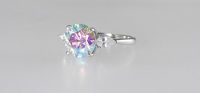 3ct Aurora Moissanite Trinity Ring, Size 7.5, Sterling with White Gold Overlay, with Cert. & Box.