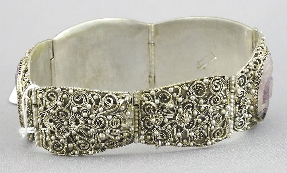 LOT 208 Antique Chinese Carved Amethyst & Filigree Silver Plated Bracelet, 7", 40.7g. Estimate: $100 - $120 Auction Date: Tuesday, February 11 2025 at 4:00 PM