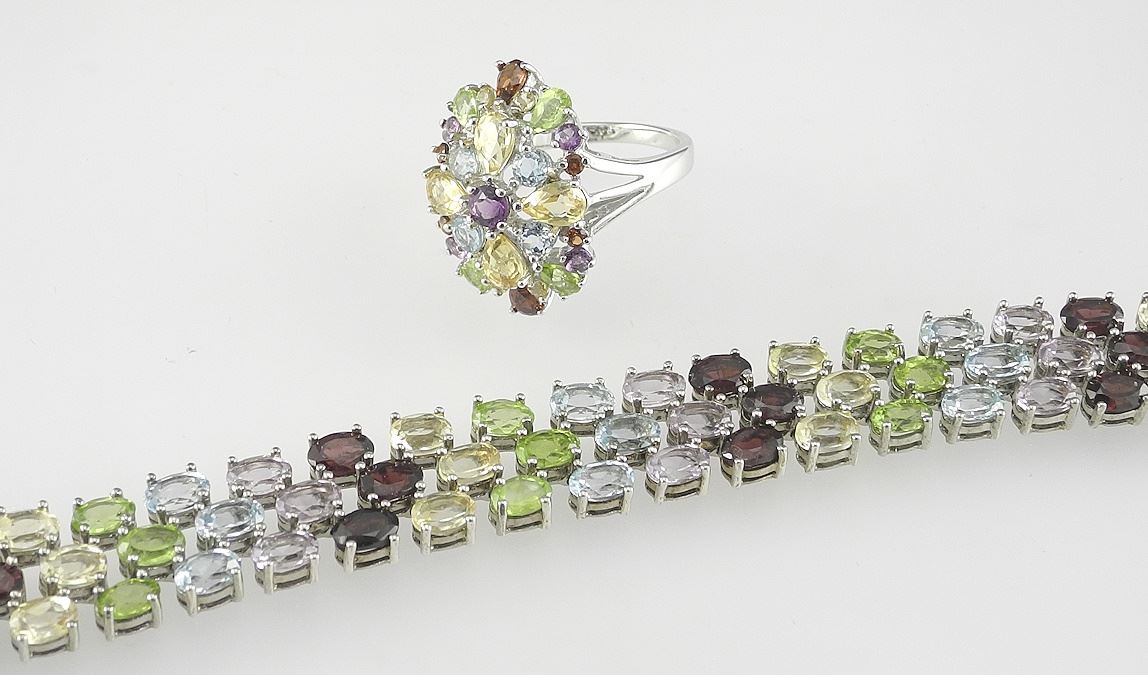 Sterling Silver (marked) Semi Precious Stone Bracelet (8 1/2") & Ring, Size 8.
