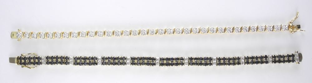 Two Gilt Sterling Silver (marked) Black Sapphire & Diamond Accent Bracelets, 7 1/4", 31.1g.