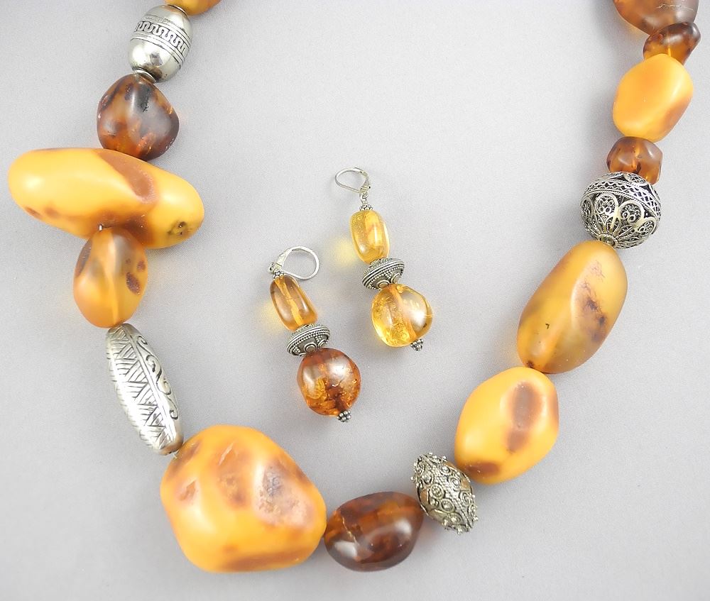 LOT 335 Amber Boulder Necklace with Silver Enhancers (29"L) & Similar Pair of Earrings. Estimate: $150 - $300 Sold For: $140 Auction Date: Tuesday, February 11 2025 at 4:00 PM