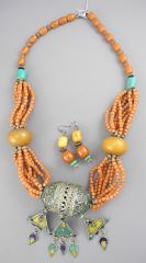 Tibetan Coral Amber Turquoise & Enamel Necklace (24"L) & Similar Pair of Earrings.