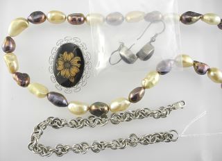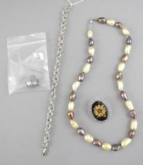 LOT 317 Sterling Silver (marked 925/14g) Bracelet with Freshwater Pearl Necklace/Floral Brooch... Estimate: $60 - $100 Auction Date: Tuesday, February 11 2025 at 4:00 PM