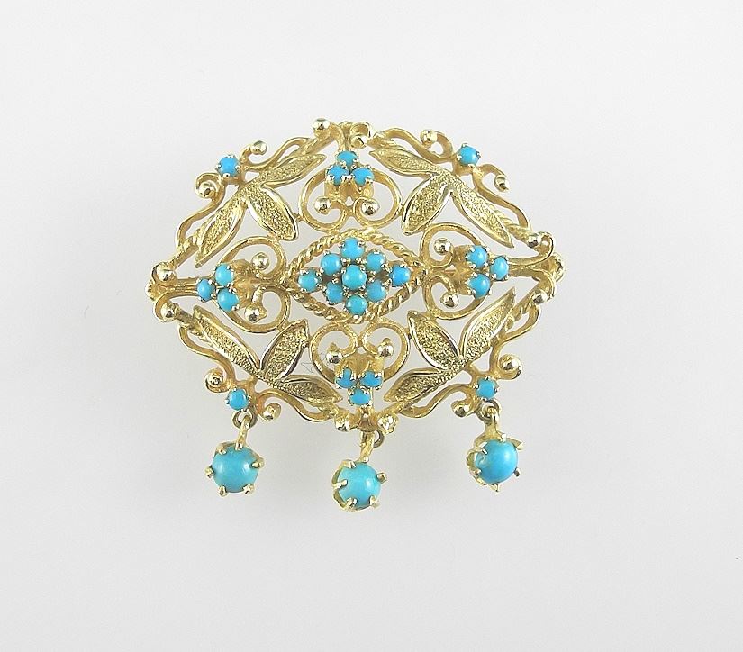 LOT 73 Birks 14K (marked BB14) Yellow Gold Brooch w/ 28 Natural Turquoise Cabochons w/ Box, 11.6 Gra Estimate: $800 - $1,000 Auction Date: Tuesday, February 11 2025 at 4:00 PM