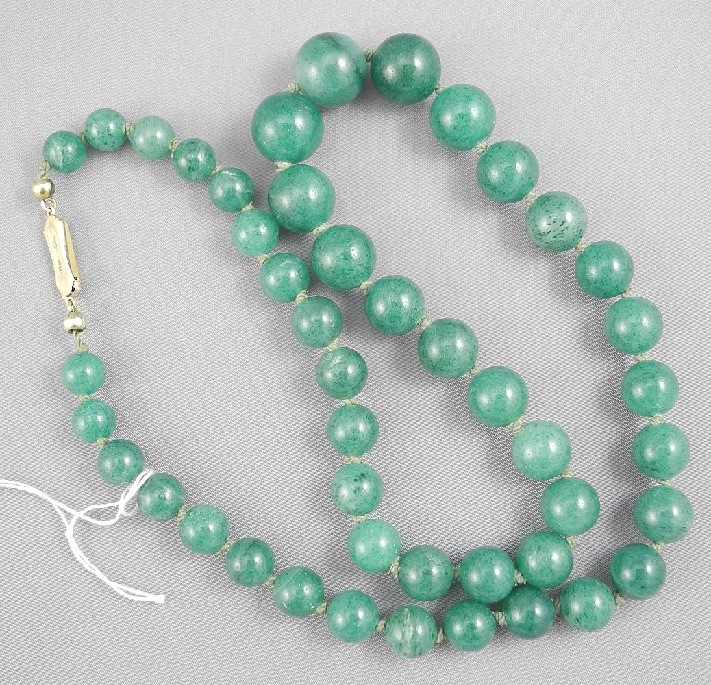 LOT 116 Natural Jadeite Necklace with 14K (marked 585) Clasp, 7 1/2 - 13mm, 21"L, 59.4g. Estimate: $500 - $600 Auction Date: Tuesday, February 11 2025 at 4:00 PM