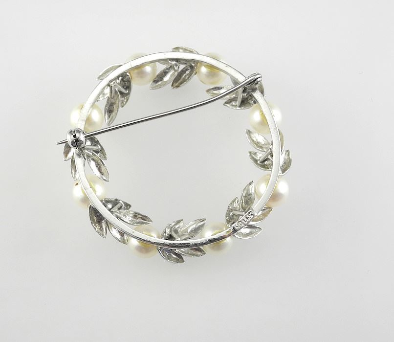 14K (marked) White Gold & Pearl Wreath Brooch, 1 5/8" Diameter, 10. 98g with Box.