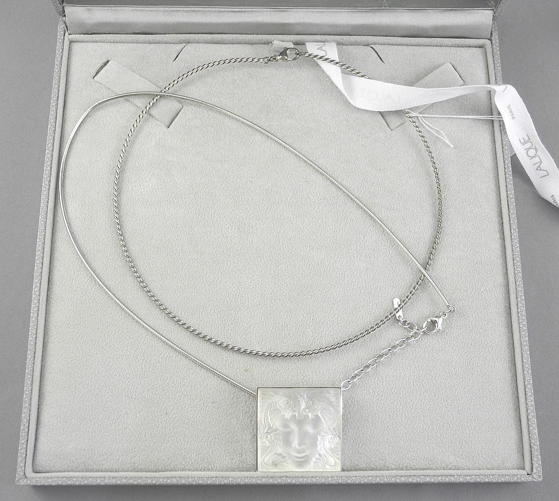 Lalique "Masque de Femme" Crystal Pendant & Earrings set in Sterling Silver , with Boxes.