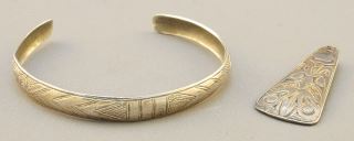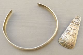 LOT 343 Northwest Coast Silver "Eagle" Pendant, Signed D.(David) Quist & an Old Unmarked Bracelet, 16g Estimate: $60 - $100 Sold For: $50 Auction Date: Tuesday, February 11 2025 at 4:00 PM