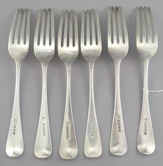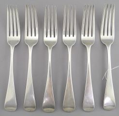 LOT 45 Six Georgian Silver Forks Monogrammed 'B', 8"L, 415g. Estimate: $300 - $400 Sold For: $375 Auction Date: Tuesday, February 11 2025 at 4:00 PM