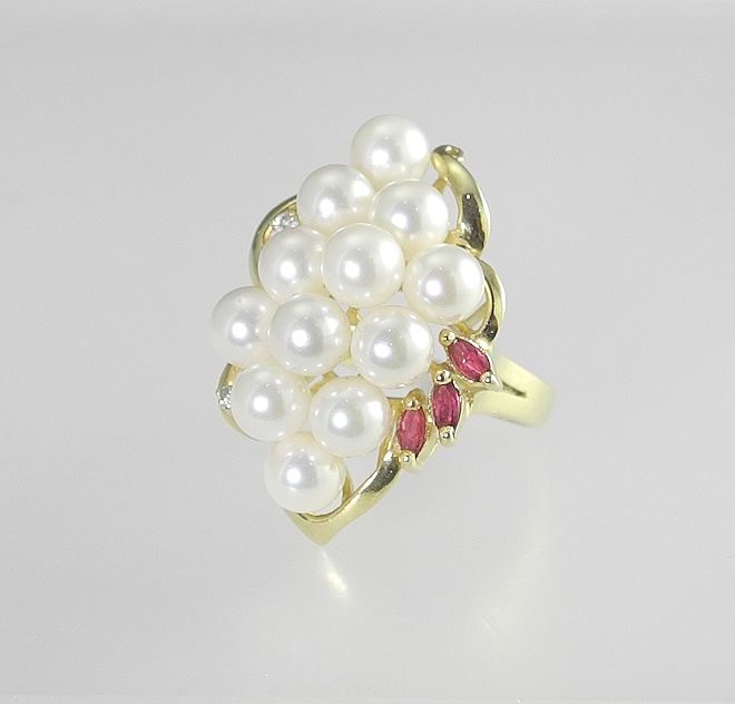 LOT 32 14K Gold Pearl Diamond & Ruby Dinner Ring, Size 7, 7.25g. Estimate: $600 - $900 Auction Date: Tuesday, August 12 2025 at 4:00 PM