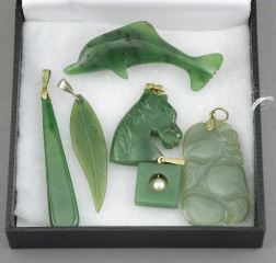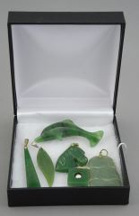 LOT 270B 5 Jade Pendants & 1 Brooch, 5/8 - 2 1/4"L, TW 33g with Box. Estimate: $60 - $100 Sold For: $45 Auction Date: Tuesday, August 12 2025 at 4:00 PM