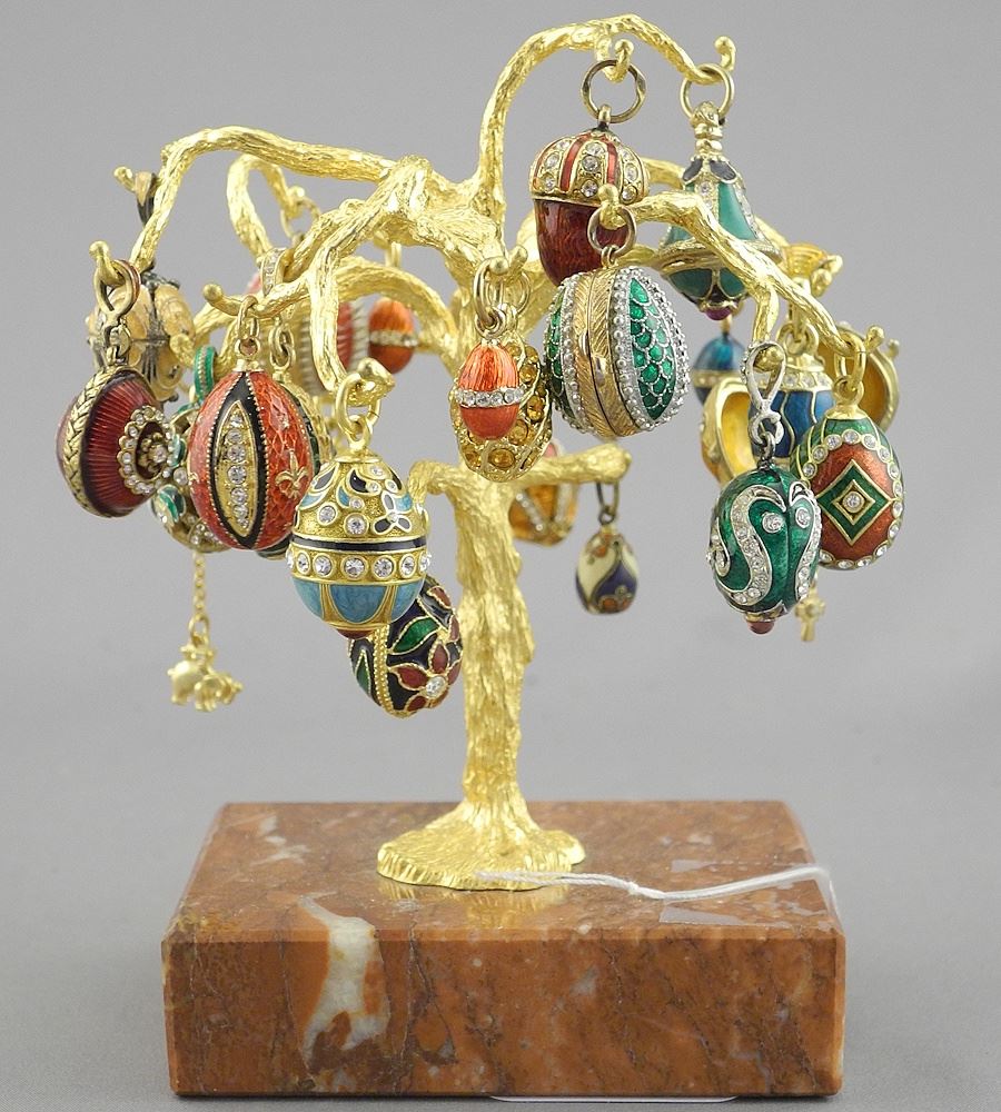 LOT 172 Faberge-Style Gilt Enamel & Diamante Pendant Egg Tree, 4 1/2"L. Estimate: $60 - $100 Sold For: $250 Auction Date: Tuesday, August 12 2025 at 4:00 PM
