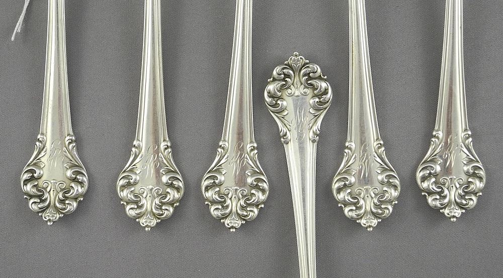 LOT 3 Twelve Reed & Barton Sterling Silver Pickle Forks Monogrammed MG, 5 1/2", 199g. Estimate: $200 - $300 Sold For: $215 Auction Date: Tuesday, August 12 2025 at 4:00 PM