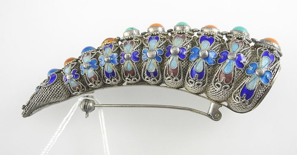 LOT 11 Chinese Silver (marked silver) Cocoon Shaped Filigree/Enamel/Coral/ Turquoise Brooch, 14.9g. Estimate: $100 - $150 Sold For: $160 Auction Date: Tuesday, August 12 2025 at 4:00 PM