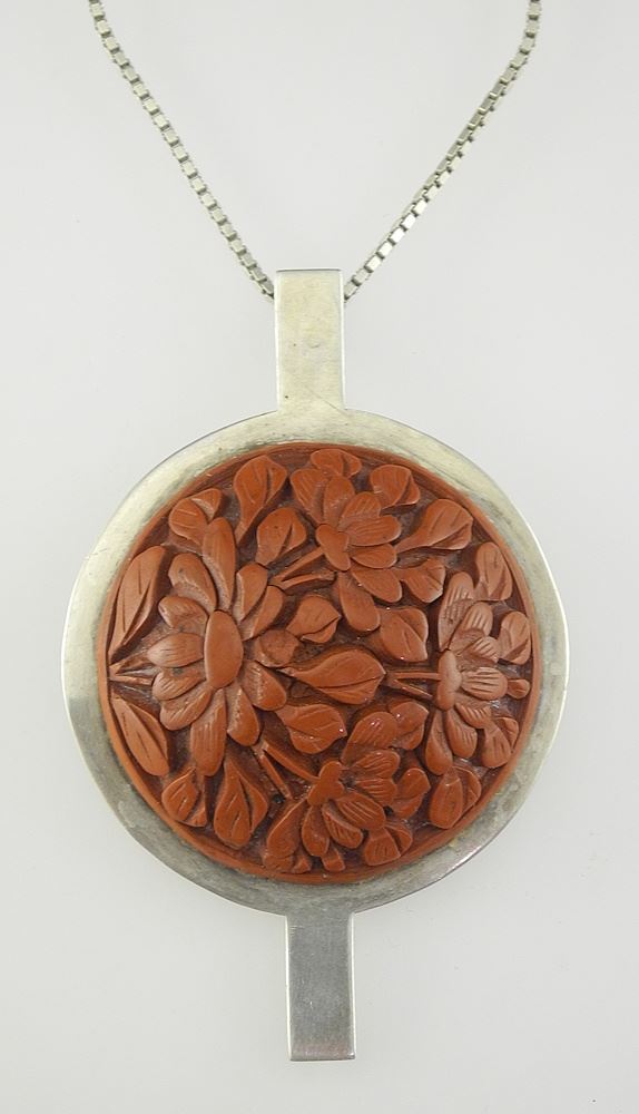 LOT 70 Chinese Carved Cinnabar & Sterling (tested) Pendant, 23"L, TW 36.4g. Estimate: $60 - $80 Sold For: $60 Auction Date: Tuesday, August 12 2025 at 4:00 PM