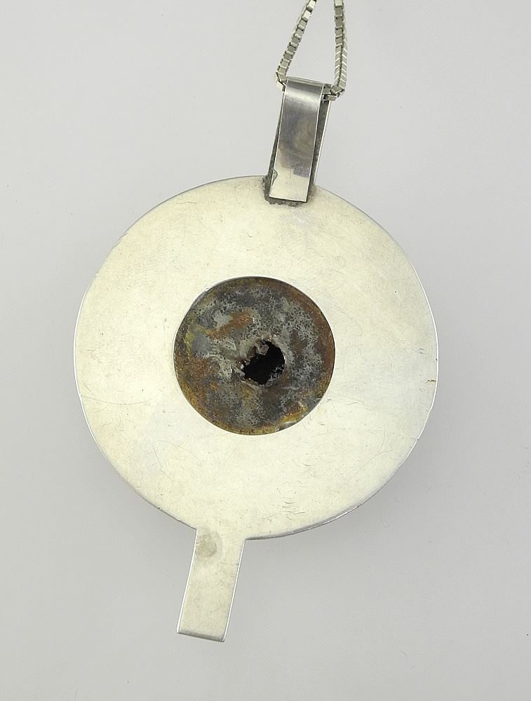 Chinese Carved Cinnabar & Sterling (tested) Pendant, 23"L, TW 36.4g.