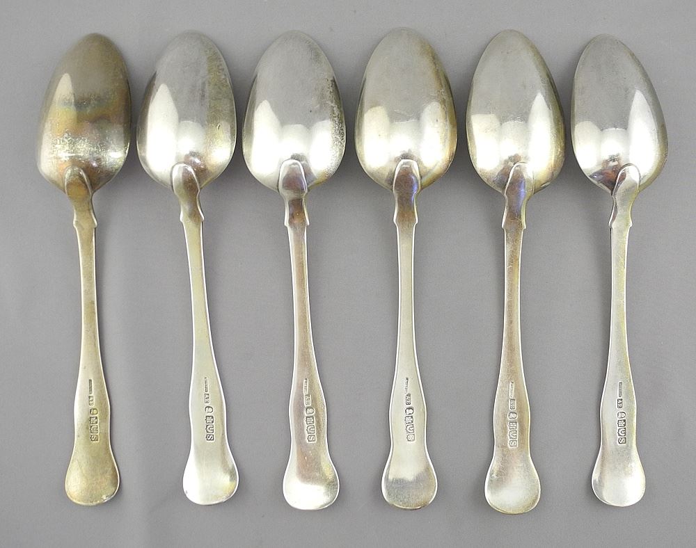 LOT 25 6 Scottish Silver Tablespoons, 8 1/2 "L, 445g. Estimate: $400 - $600 Sold For: $460 Auction Date: Tuesday, August 12 2025 at 4:00 PM