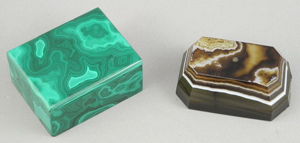 Malachite Box (2"w) & Agate Paperweight, 2 1/8"w (chipped).