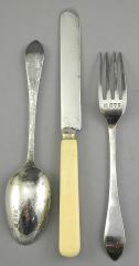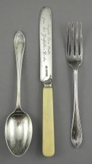 LOT 31 Hallmarked Silver Christening Cutlery Set, Blade Engraved, TW 77g Including Handle. Estimate: $100 - $150 Sold For: $100 Auction Date: Tuesday, December 02 2025 at 4:00 PM