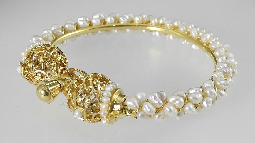 Unmarked Gold & Pearl Hinged Bracelet, 2 5/8"w, 40g.