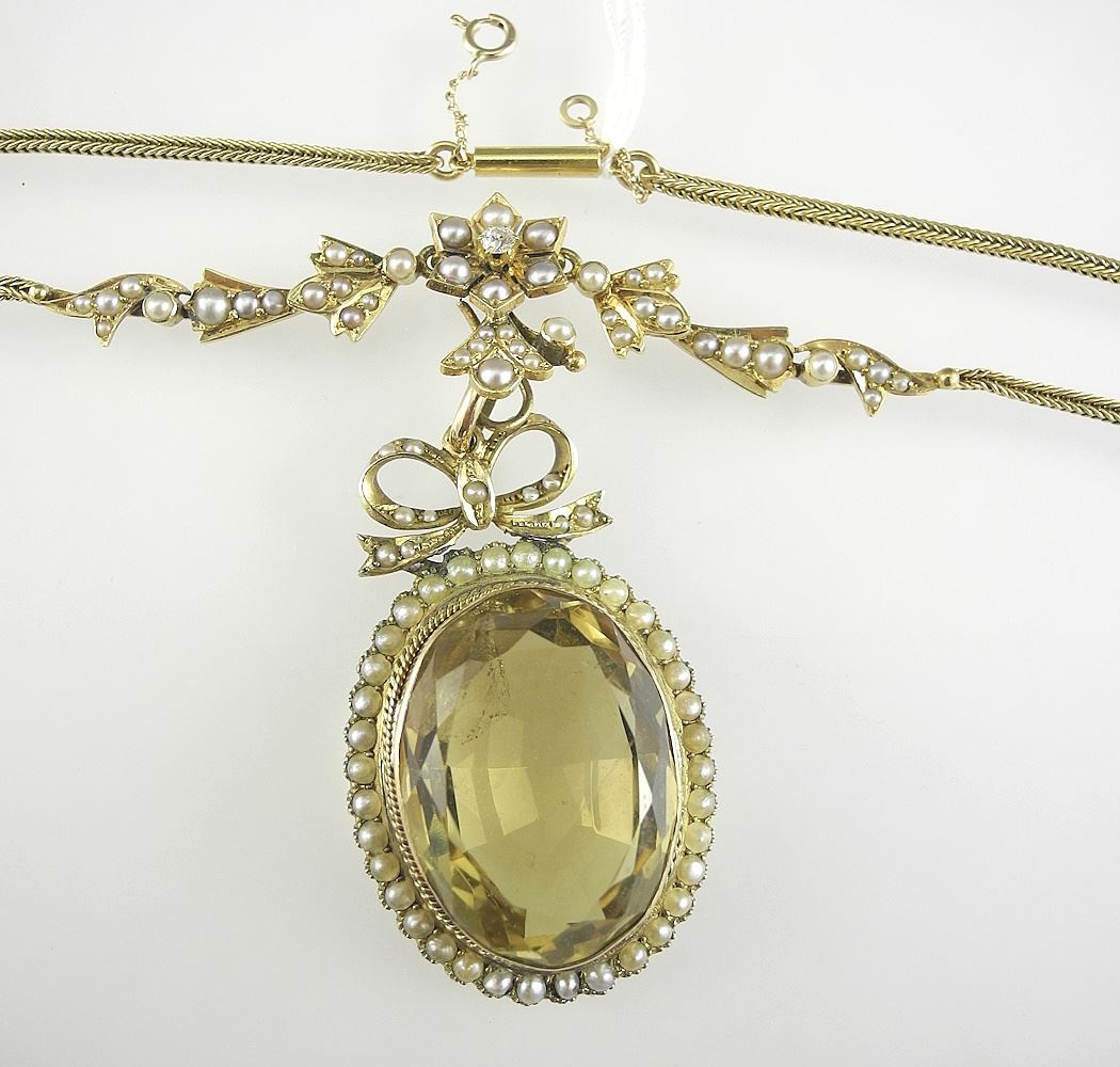 9CT (marked) Gold Citrine Half Seed Pearl & Diamond Necklace, 14"L, 22.6g.