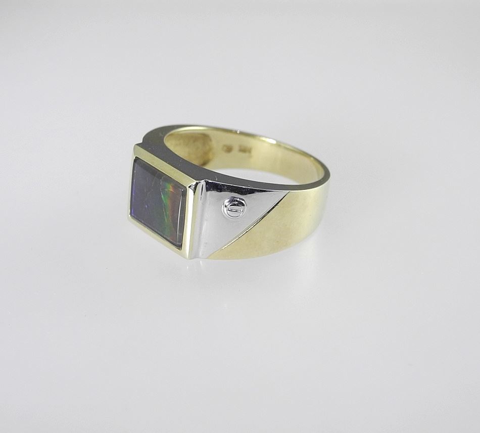 LOT 153 14K (marked) Yellow & White Gold with Ammolite Gent's Ring, Size 9 3/4, 6.5g. Estimate: $600 - $1,000 Auction Date: Tuesday, December 02 2025 at 4:00 PM