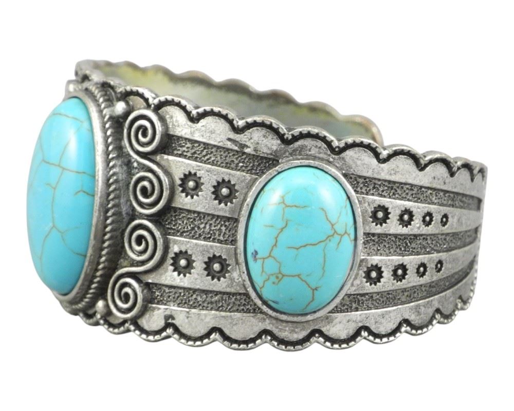 LOT 272 Southwest Style White Metal Cuff Bracelet, 2 1/2"w with Turquoise Cabochons. Estimate: $50 - $60 Sold For: $25 Auction Date: Tuesday, December 02 2025 at 4:00 PM