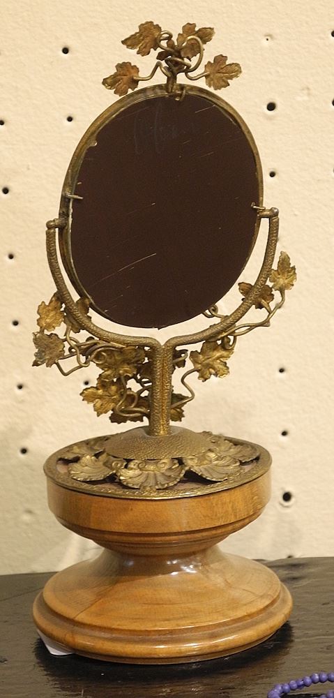 19th C. Petite Stamped Brass Dressing Mirror on Wood Base, 8"h.