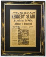 LOT 580 Framed newsprint headline 1963, "Kennedy Slain....". Estimate: $25 - $50 Sold For: $30 Auction Date: Tuesday, August 11 2020 lots 1-200 at 1:00 PM, lots 401-624 at 7:00 PM