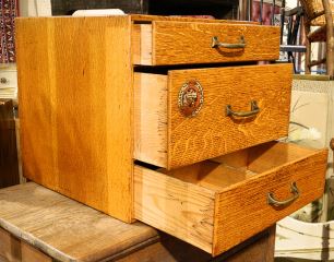 LOT 69 Small Oak 3 Drawer File Cabinet, 16 3/8" high. Estimate: $100 - $200 Sold For: $50 Auction Date: Tuesday, November 16 2021 at 6:00 PM