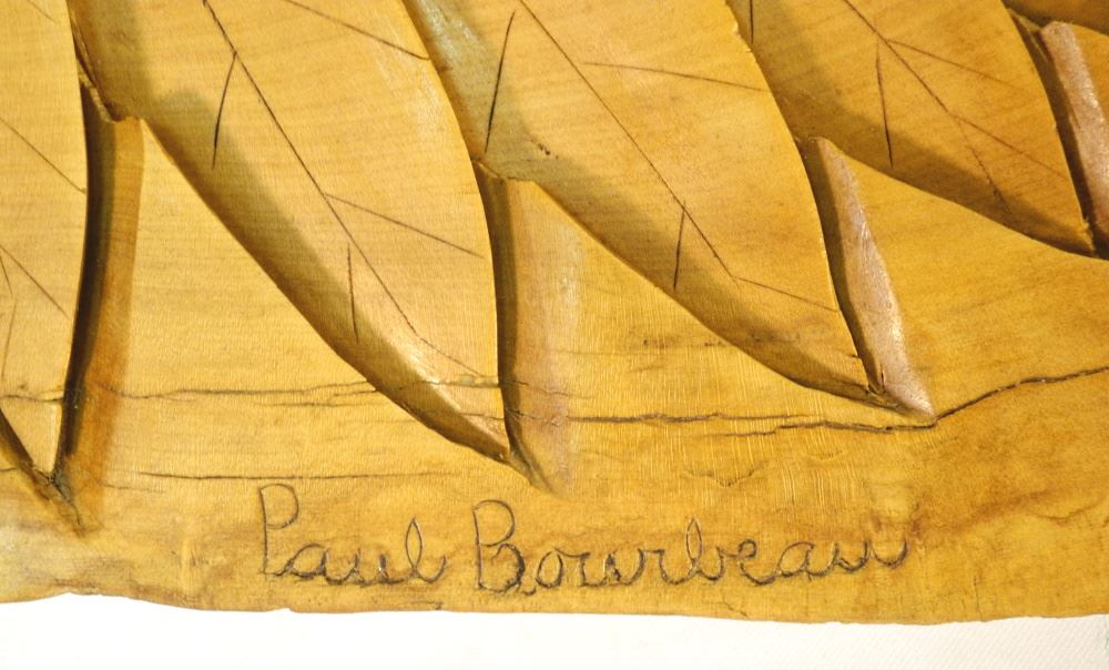 Carved Wood Panel signed Paul Barbeau, 25" wide, "First Nations Portrait".