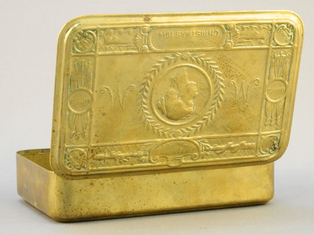 LOT 419 Princess Mary Christmas 1914 Brass Gift Box, 5 1/8" Wide. Estimate: $50 - $60 Sold For: $50 Auction Date: Tuesday, November 08 2022 at 6:00 PM
