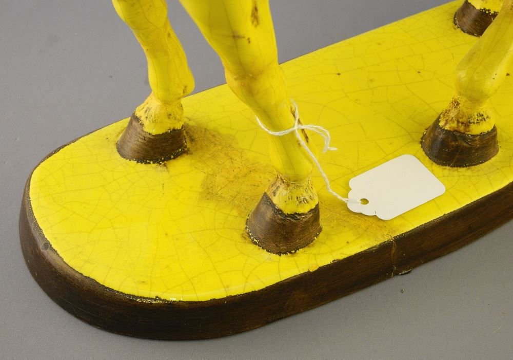 LOT 287 Yellow & Brown Glazed Pottery Horse, Base & Front Legs Restored, 12". Estimate: $50 - $60 Sold For: $40 Auction Date: Tuesday, November 08 2022 at 6:00 PM