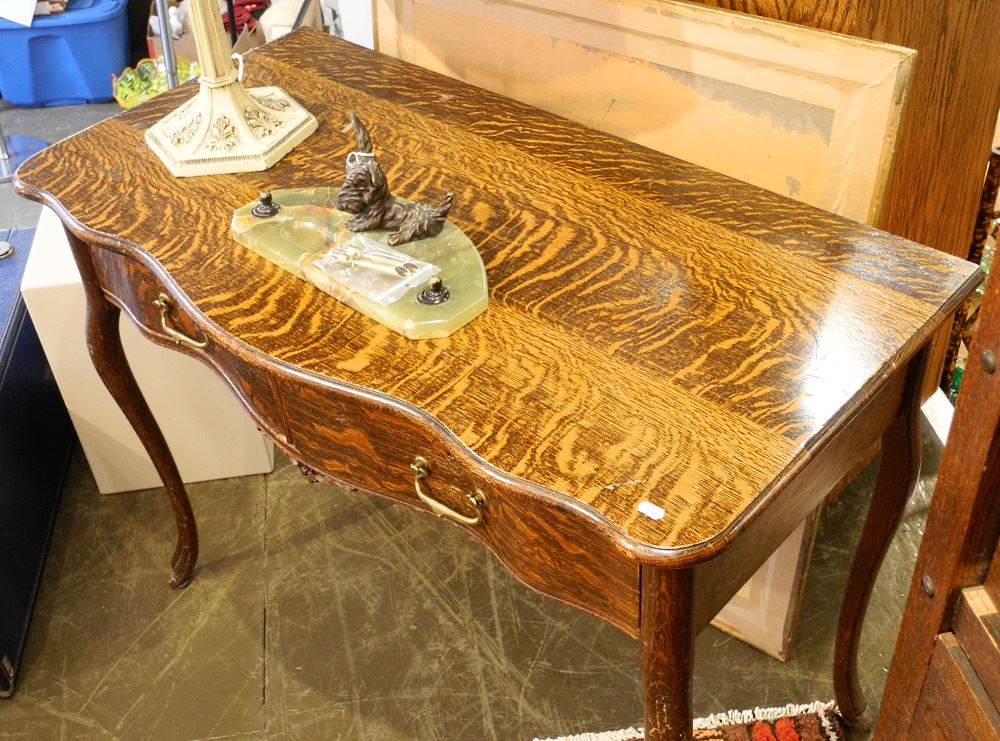 LOT 57 Canada Furniture Manufactures Golden Oak Writing Table, Toes Missing, 40" wide. Estimate: $100 - $200 Sold For: $80 Auction Date: Tuesday, November 08 2022 at 6:00 PM