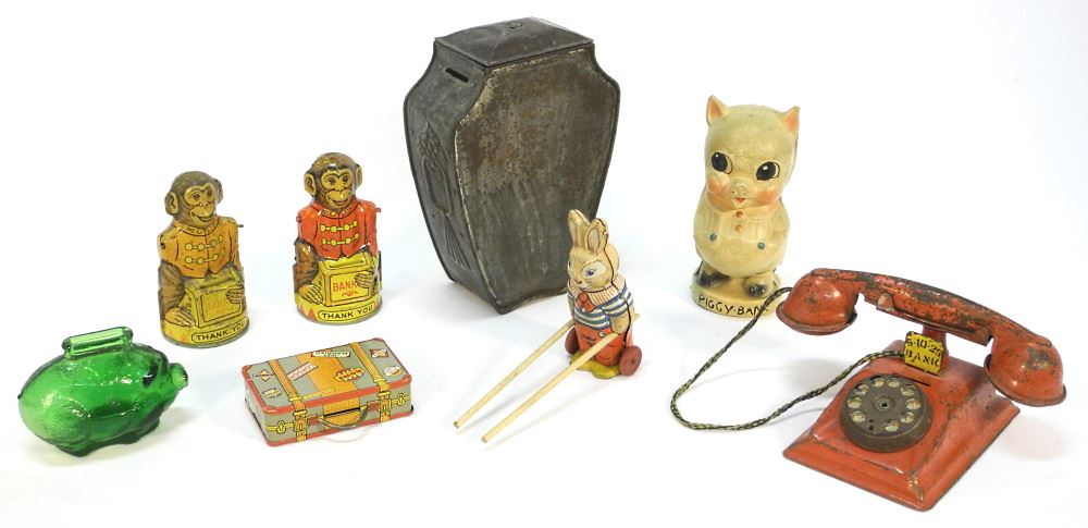 LOT 412 Collection of 8 Coin Banks: Monkeys/ Pigs/ Etc., 8 1/4" High. Estimate: $60 - $80 Sold For: $120 Auction Date: Tuesday, November 08 2022 at 6:00 PM