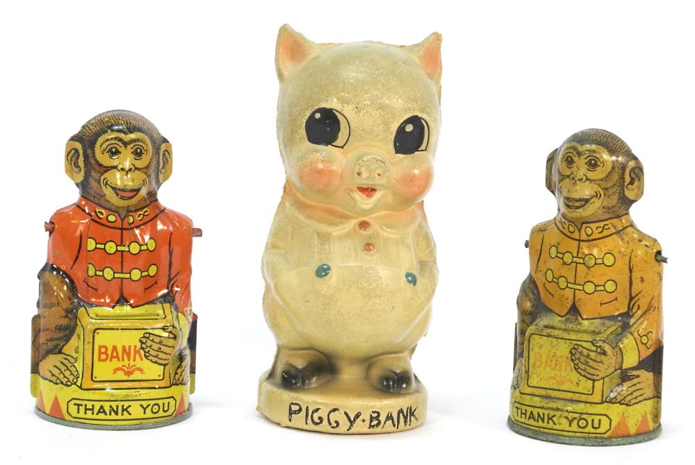 Collection of 8 Coin Banks: Monkeys/ Pigs/ Etc., 8 1/4" High.