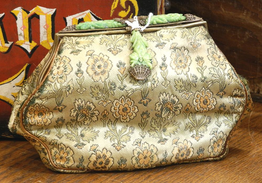 Antique Filigree & Silk Handbag with Faux Jade Details, 8 1/4" Wide.