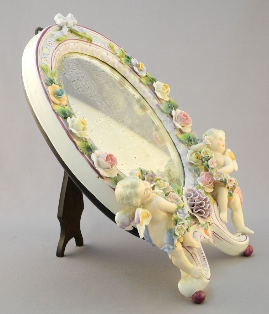 European Porcelain Figural Dresser Mirror, 12" x 8 3/4" x 2 3/8", Chips & De-silvering Noted.