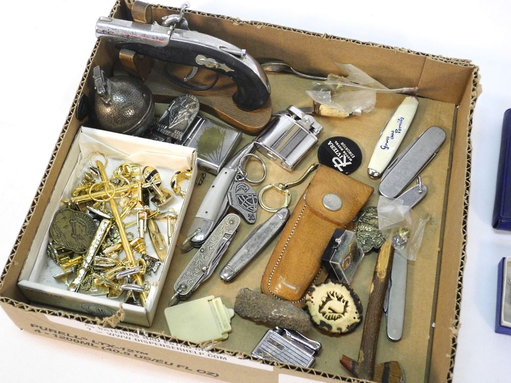 LOT 348 Collection of Pocket Knives/ Cuff Links/ Lighters/ Harmonica, etc. Estimate: $60 - $100 Sold For: $80 Auction Date: Tuesday, January 31 2023 at 6:00 PM