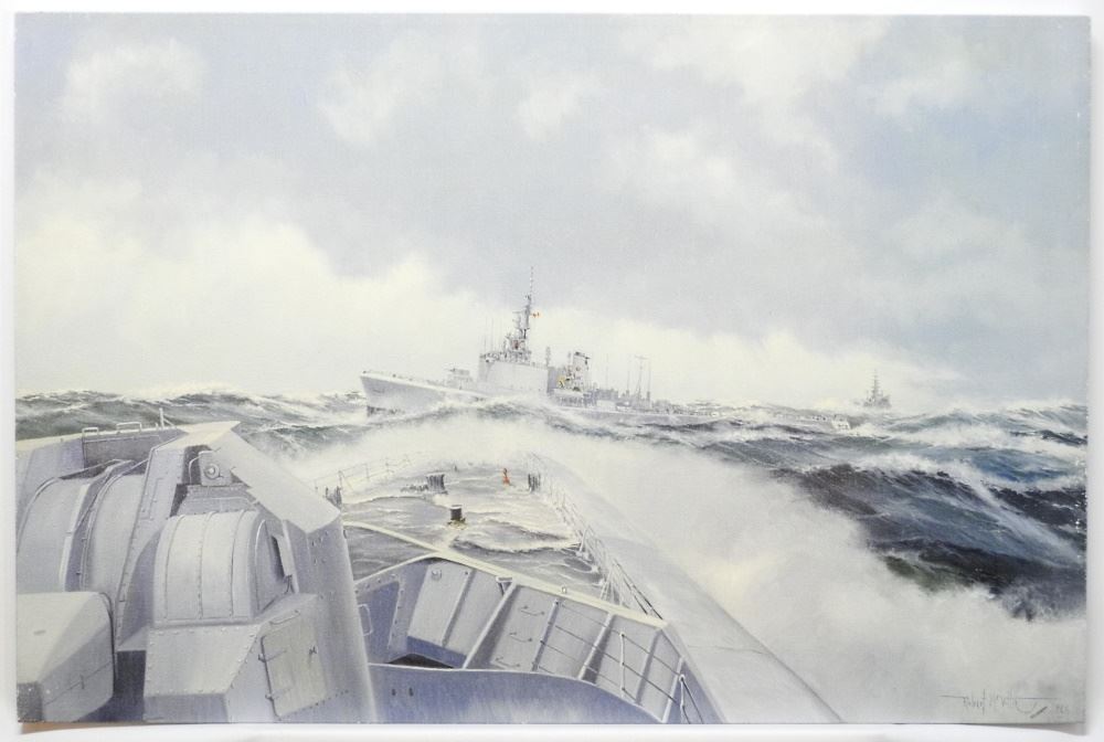 LOT 198 Print Mounted on Canvas Signed Robert McVittie, 24" x 36", "Destroyer at Sea". Estimate: $60 - $100 Sold For: $80 Auction Date: Tuesday, January 31 2023 at 6:00 PM