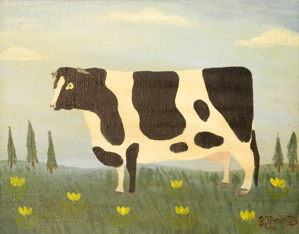 LOT 163 Oil Artist's Board Signed G. Mowatt 1996, 15 1/4" x 18 3/4", "Folk Art Cow". Estimate: $50 - $60 Sold For: $190 Auction Date: Tuesday, January 31 2023 at 6:00 PM