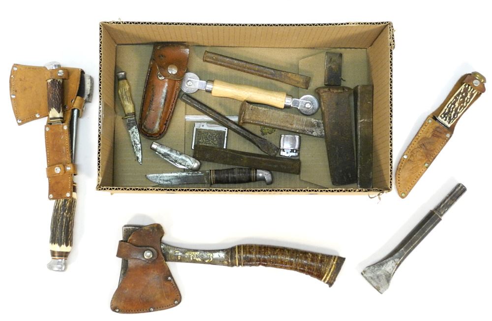 Collection of Vintage Knives/ Hatchets/ Wedges/ Lighters, all as found
