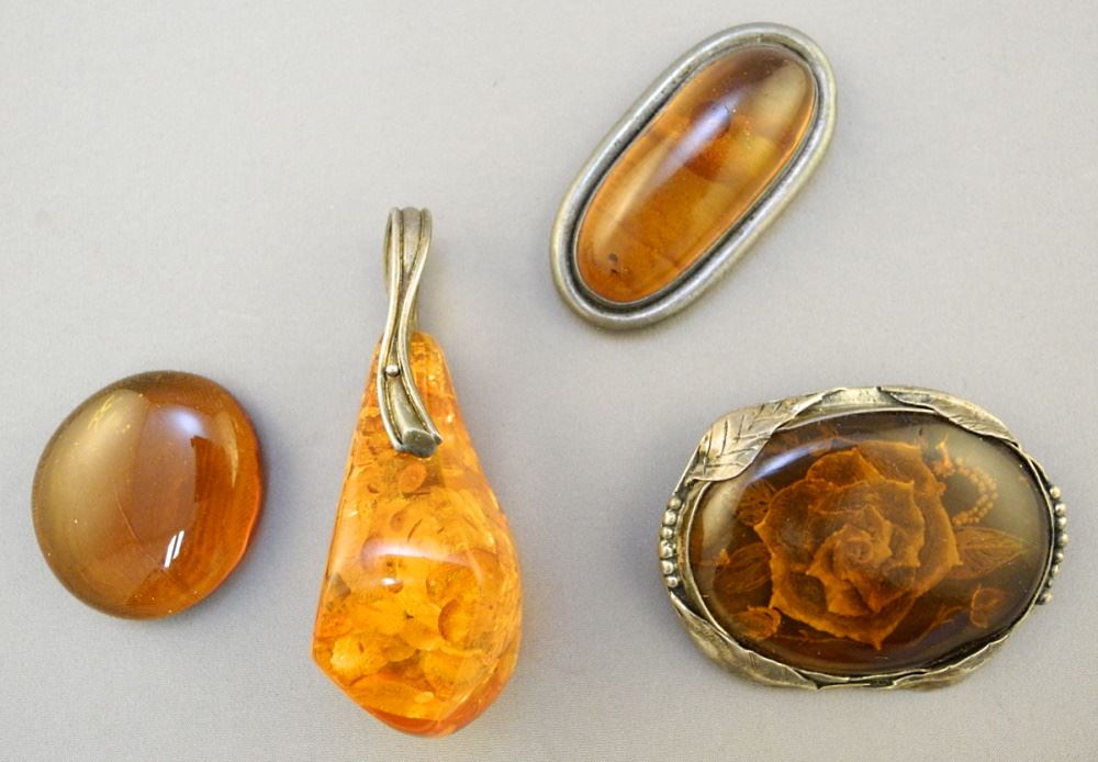 5 Amber-Style Jewelry Items: 2 Brooch (No Clasp), Pendant Triangular Necklace Damage