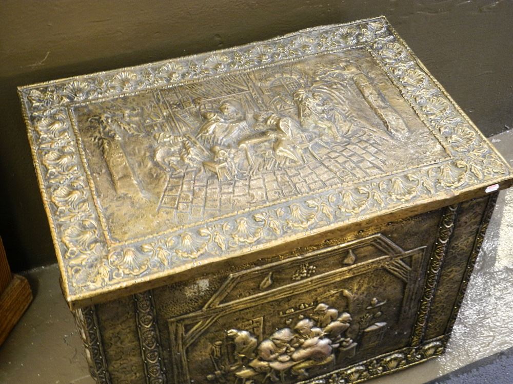 LOT 53 Brass Wood Box with Set of Fire Irons, W 26 1/2". Estimate: $50 - $100 Sold For: $80 Auction Date: Tuesday, January 31 2023 at 6:00 PM